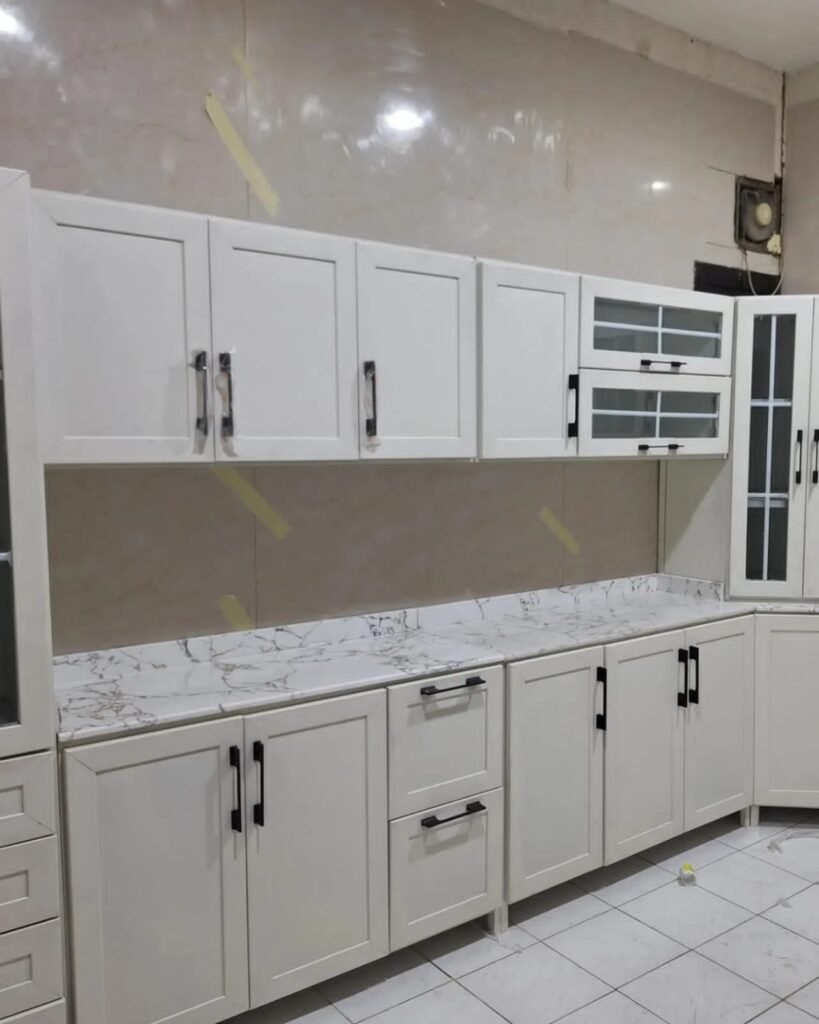 نستخدم أجود أنواع الخشب والرخام والاكسسوارات لضمان متانة المطبخ وسهولة تنظيفه وصيانته، مما يضمن لك استخدامًا طويل الأمد دون أي مشاكل.